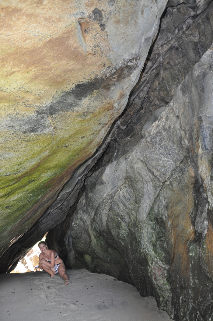 действительно белый песок. сосны. пляж. на пляже никого. только пара собак, спасатель, хозяин шека (тут так называются пляжные кафе-рестораны), наш водитель и мы с Катей. покупались, покушали. мимо нас прошел муж с женой и с корзиной кокосов. мы у них купили, и увидели что они ушли к скалам на краю пляжа и там куда то пропали. мы решили пойти посмотреть куда они пошли. обнаружили там пещеру. пошли в эту пещеру и оказалось что она ведет сквозь эти скалы и выходит на другую сторону этих скал! по ту сторону уже вообще не было никого! скалы эти обойти было невозможно. только через пещеру или по воде. мы решили уединиться на этом секретном пляже. взяли вещи и пошли загорать туда.