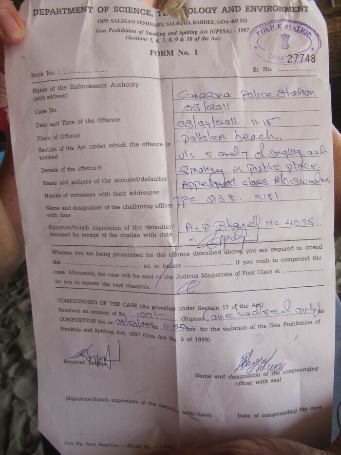 на утро, когда мы пили кофе с банановым кексом под гигантским деревом баньян, вдоль пляжа бежал индус и что-то всем кричал. когда он пробежал мимо нас , мы поняли что он всех предупреждает о том, что идут полицейские! и чтобы никто не курил! это было очень странно. действительно вскоре появились полицейские. они подошли к одной не молодой даме, которая лежала и курила сигарету. и что-то начали ей предъявлять. в итоге выписали ей штраф и радостные ушли обратно. мы подошли и спросили у нее что случилось? она оказалась англичанкой и радостно сообщила нам, что ее оштрафовали за курение сигарет в общественном месте. она была рада этому факту , что сказала что сохранит на память этот штраф. ее видимо поразило то, что не смотра на то, что вокруг все курят марьиванну, полицейские ее оштрафовали за сигарету. выписанный штраф я тоже сфоткал себе на память. вот он. -----