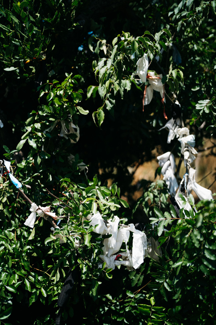 Недалеко от бывшей пещеры можно увидеть интернациональную традицию оставлять на дереве ленточки и желания загадывать. В эпоху постковида ленточки заменялись на маски.