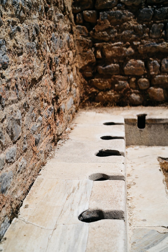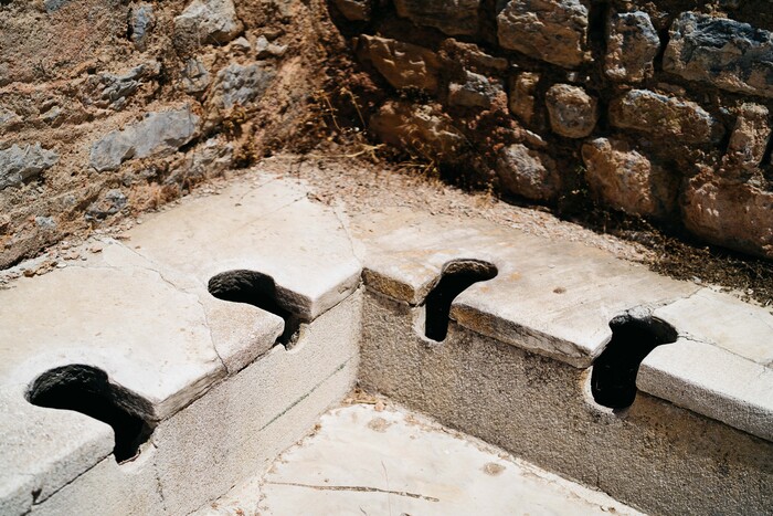 Мы в латрине. Древнем общественном туалете. Никаких тебе кабинок и уединения. Все близко друг к дружке. Сел по делам, а ноги о соседние трутся.