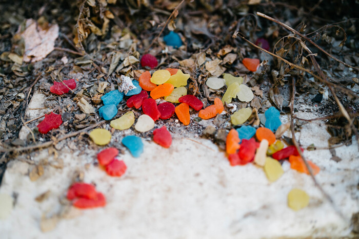 Я не единственный гость тут за последнее время. Кто то не поленился поделиться с местной живностью мармеладками. Уж не знаю это приношение какое-то мистическое, или просто птичек и мышек решили покормить. Но эти яркие краски конфет смотрелись крайне крипово на каменном столике.