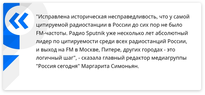 — Исправлена историческая несправедливость, что у самой цитируемой радиостанции в России до сих пор не было FM-частоты, — подчеркнула она.