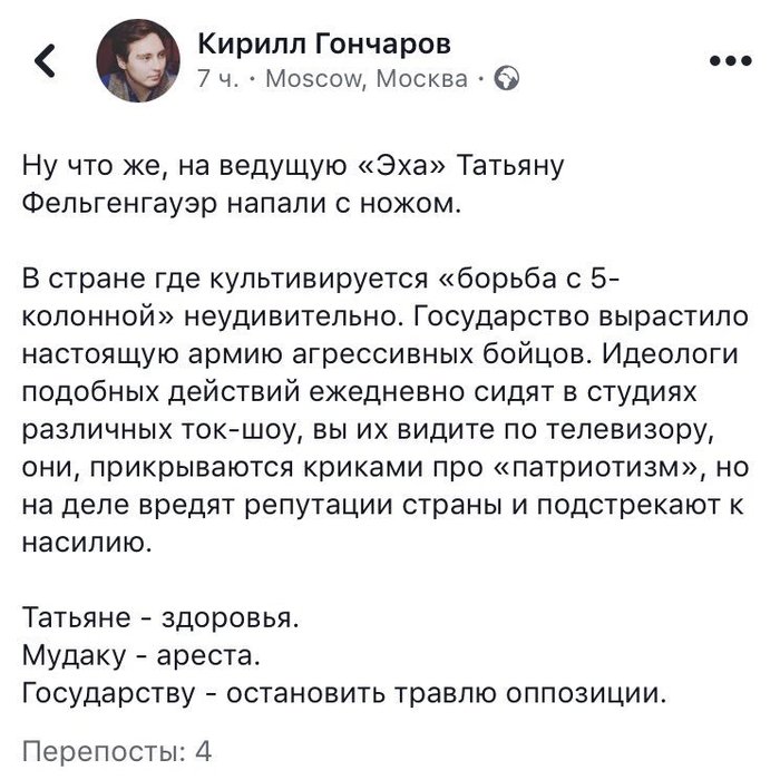 Напавший на Фельгенгауэр кандидат наук, гражданин Грузии и Израиля. Но все равно во всем виноват Киселев и ватники.