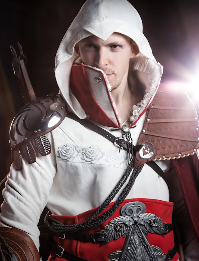 На самом деле давно смотрю этого паренька - больно крутые и интересные видео делает. По вселенной ведьмака и схожим тематикам. В данном ролике он скрафтил костюм Ezio Auditore de Firenze. Использовал, в частности, кожу. А так же металл и ткань.