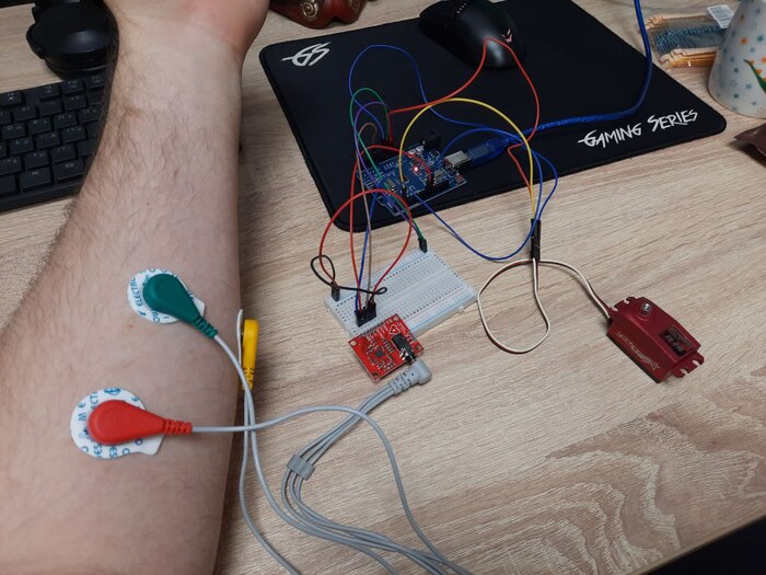 Проект был посвящен созданию протеза с использованием нейроинтерфейсов. Нужно было с помощью датчика ЭМГ считывать мышечные сокращения и преобразовывать их с помощью микро контроллера. Затея интересная с точки зрения ознакомления с электроникой. Далее много паяли, печатали детали, писали код. Все не гладко, было казусы, но по итогу мы достигли более менее рабочего результата.
