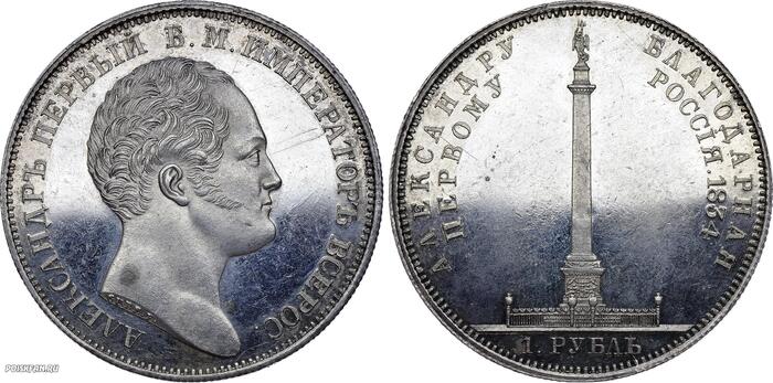 В честь открытия Александровской колонны в Петербурге в 1834 году, был отчеканен первый русский серебряный памятный рубль. Сама колонна была установлена в 1832 году, монета была отчеканена в 1836 году, но датируется она 1834 годом.