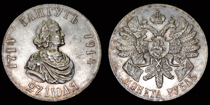 Чеканка произведена в 1914 году в количестве 30 тыс. штук для участников военного парада, посвящённого 200-летию великой морской победы при Гангуте и спуску на воду крупного линкора «Гангут». Начавшаяся война помешала проведению парада и почти весь тираж пошёл на переплавку. В 1916 выпустили ещё 300 штук (с прежней датой) по приказу князя Сергея Михайловича. Есть мнение, что в 1927 году по заказу коллекционеров выпустили большое количество новоделов, но информация весьма спорная. Отличия новодельных монет от оригинальных неизвестны.