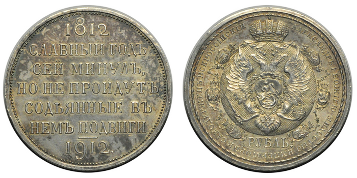 В России широко было отпраздновано 100-летие Отечественной войны 1812 года. В честь этого великого события отчеканили эту монету небольшим тиражом всего в 26000 экземпляров. Весть тираж рубля был предназначен для раздачи солдатами и унтер-офицерам, которые принимали участие в параде, посвященному этой знаменательной дате. Стоит отметить, что это единственная серебряная монета, на которой нет изображения правителя.