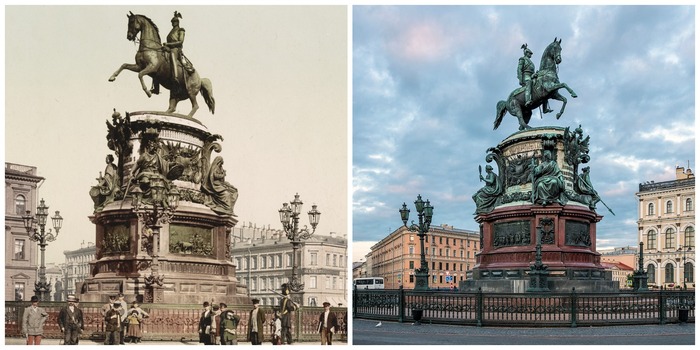 Памятник Николаю I создавался с 1856 по 1859 год по проекту архитектора О. Монферрана. Массивная конная статуя весом 21 тонну (работа П.К. Клодта) установлена на высокий каменный постамент с барельефами и четырьмя аллегорическими скульптурами.