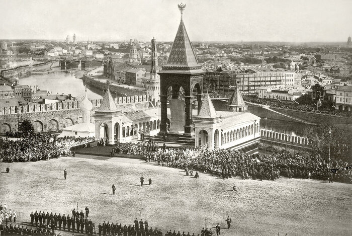 В 1890 году в Московском кремле начались работы по сооружению величественного памятника Александру II, отцу правившего тогда императора. Через 3 года был заложен первый камень, а в августе 1898 состоялось торжественное открытие (уже в присутствии Николая II). Монумент включал в себя большой шатёр со статуей и колоннаду в виде буквы "П" с двумя малыми шатрами на концах. Пришедшие к власти большевики посчитали монумент не соответствующим новой эпохе и в 1918 году статую императора убрали. Ещё через 10 лет всё сооружение было разобрано.