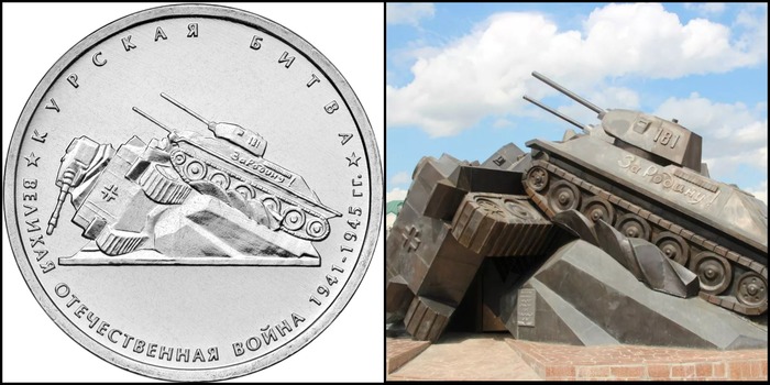 На монете изображена скульптурно-художественная композиция «Танковое сражение под Прохоровкой. Таран» Монумент сохраняет память о подвиге членов экипажа танка Т-34 из 181-й танковой бригады.