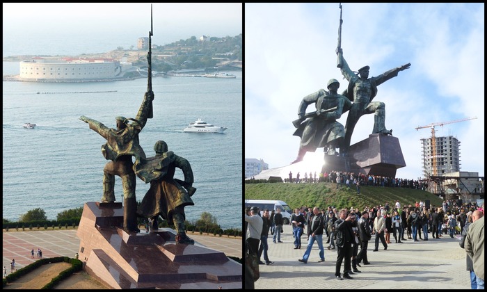 Памятник Солдату и Матросу на мысе Хрустальный в Севастополе имеет реалистичный, но грубоватый вид. Величественный монумент привлекает своей масштабностью и отточенными деталями матроса и солдата, идущих в последний бой.