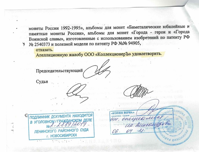 И вот после долгих разбирательств 21 января 2021 года Новосибирским областным судом Решение Ленинского районного суда об обязании «КоллекционерЪ» прекратить изготовление, изъять и уничтожить альбомы-книги для монет отменено в полном объеме. Мы доказали суду, что не нарушали никаких патентных прав и можем продолжать свою работу по этому товару.