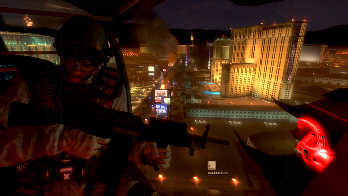 Rainbow Six: Vegas работает на Unreal Engine 3, и это одна из первых игр, построенных на этом движке. Поэтому у неё есть все типичные черты «раннего Unreal’а»: блеклые текстуры, немного пластиковые лица и повсеместный серо-коричневый фильтр. Впрочем, игру спасает окружение — ведь действие разворачивается не в безликих военных базах, а в самом сердце Лас-Вегаса. Казино, фойе отелей, стеклянные витрины, голограммы и вспышки неона — всё это разрушается во время перестрелок, создавая красивый хаос. Когда в очередной раз выстрел попадает в рулетку или стеклянный бар, а вокруг летят фишки и бокалы — именно тогда вспоминаешь, зачем игру вообще назвали Vegas.