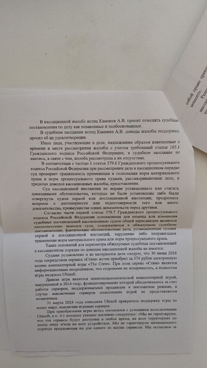 Краткое содержание: компания Ubisoft отказалась возвращать мне деньги за игру The Crew после прекращения поддержки (отключения серверов). При этом была единовременная покупка с правом бессрочного пользования игрой как цифровым товаром. Я обратился за судебной защитой. Подробно см. остальные посты серии.