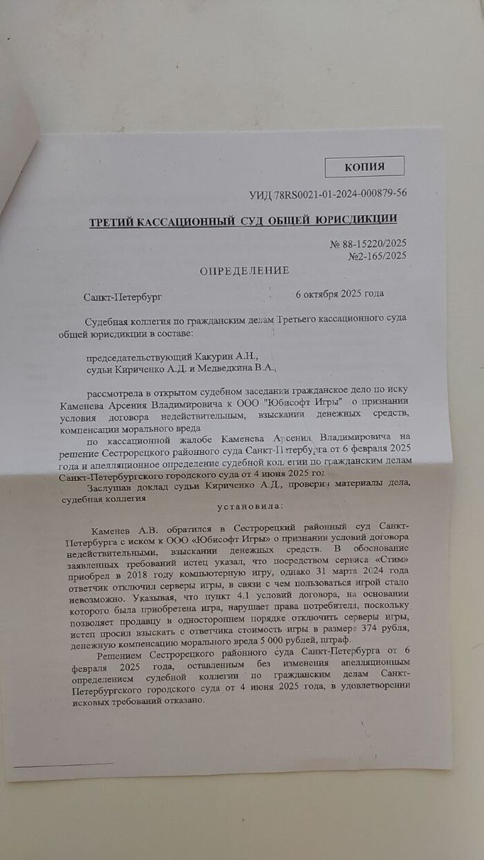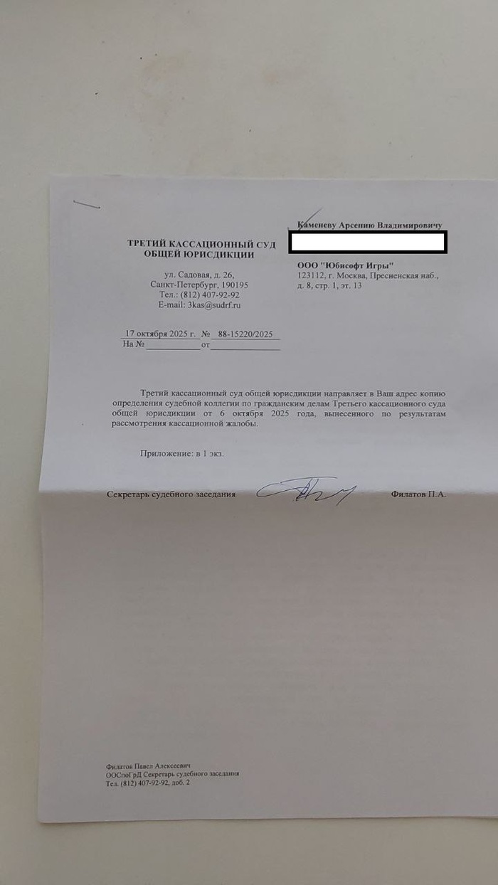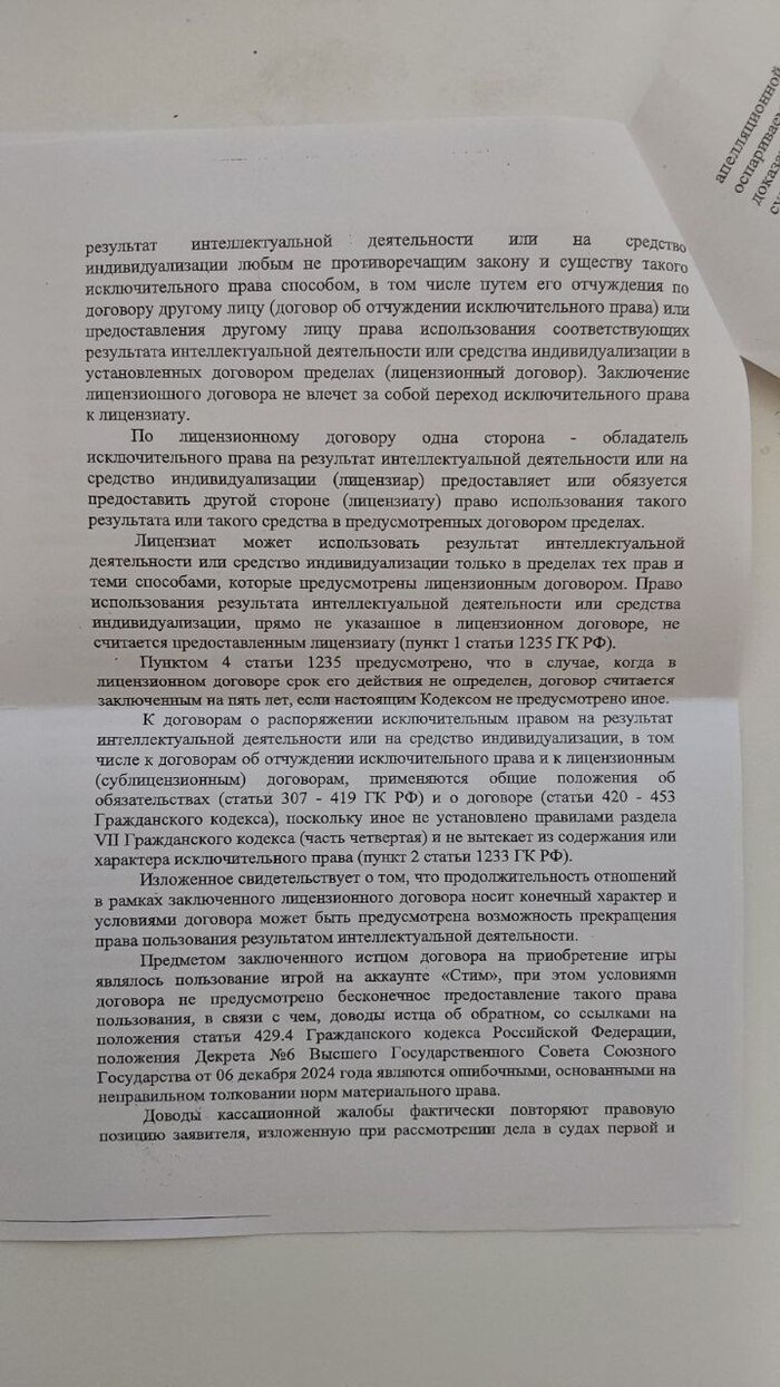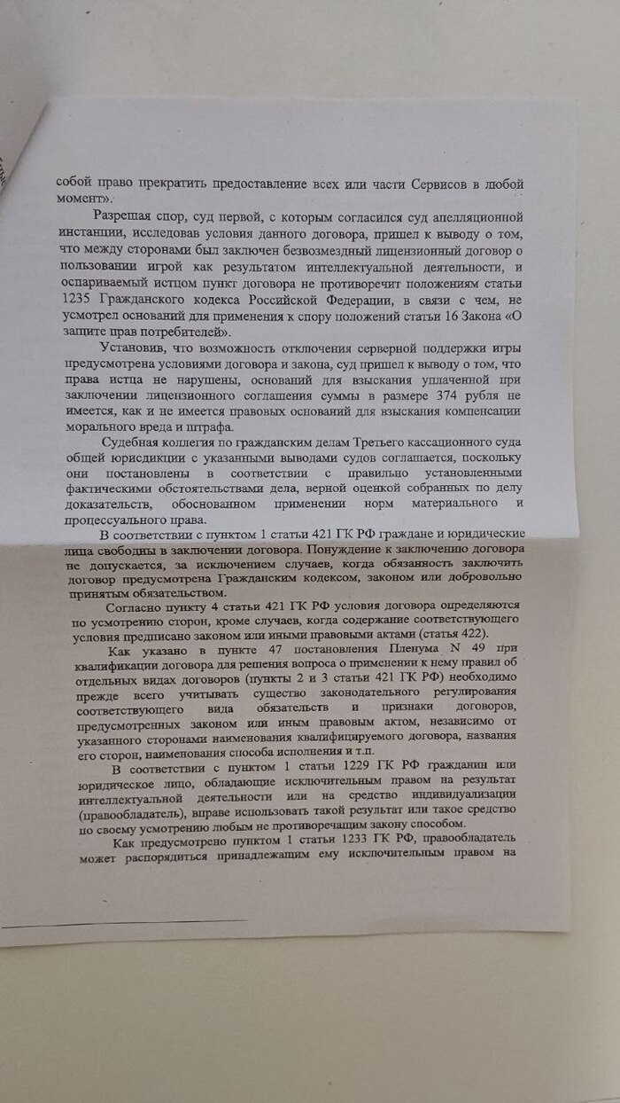 1) суд кассационной инстанции вслед за судом первой и апелляционной инстанций сослался на лицензионное соглашение Ubisoft, не обратив надлежащего внимания на то, что этот документ по причинам, изложенным в исковом заявлении, утратил юридическую силу по отношению к видеоигре The Crew, и не мог быть применён при рассмотрении моего спора с Ответчиком;