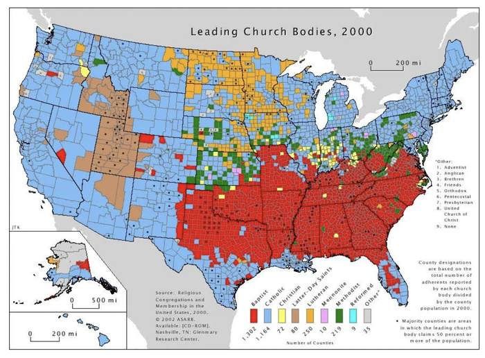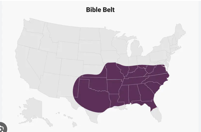 На юге плодородные почвы, на которых экономически целесообразно использование рабской силы, плюс крупные морские порты, через которые завозились рабы из Африки. После Гражданской войны, регион сделал религию последним оплотом для отстаивания своих ущемленных гордостей и свобод. Мол, пусть по уровню жизни и экономического развития ны в конце всех списков. Зато у нас тут истинные Христианские ценности!