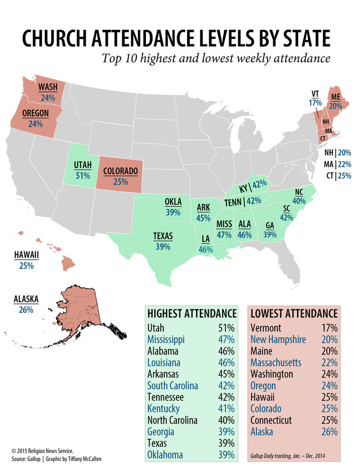 В лидерах штат Юта - 51% (из-за масонов), за ним следуют Миссиссиппи 47%, Алабама 46%, Луизиана 46% (из-за высокого процента чернокожего населения, практикующих Африканский Баптизм/Методизм).