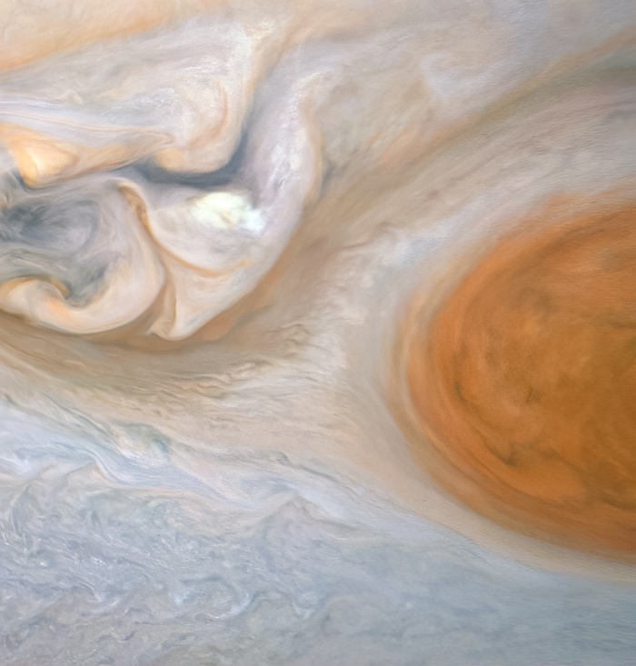 Сложно не узнать большое красное пятно Юпитера. На этом изображении с улучшенными цветами видно оранжево-красное тело этого знаменитого шторма. Учёные думают, что красноватый цвет появляется из-за взаимодействия солнечного света с находящимся в атмосфере гидросульфидом аммония. Можно видеть часть жёлто-коричневого пояса и белый циклон, лишь немного уступающий размером Земле. Разные цвета, вероятно, появляются благодаря отражению солнечного света от различных химических веществ, присутствующих в облаках.