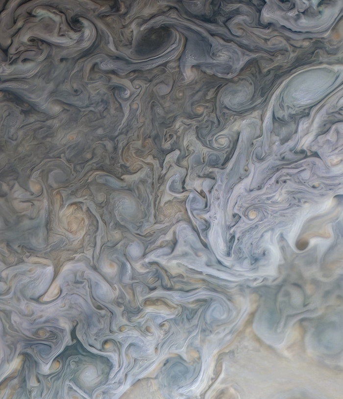 Снимки получены аппаратом Юнона (Juno, NASA) 25 июля 2020 года на высоте 151367.3 километров над южным полюсом Юпитера, обработка в Photoshop моя от начала и до конца.