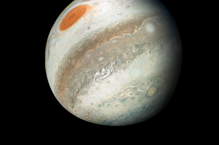 Скорее всего почти все люди, когда-либо любовавшиеся снимками Юпитера, привыкли к тому, что его знаменитое Большое красное пятно находится «внизу» — в южном полушарии газового гиганта. Но не стоит забывать, что космос является трехмерным пространством. В нем нет понятий «верха» или «низ» — это исключительно вопрос точки обзора. Представленное ниже изображение аппарата «Юнона» наглядно демонстрирует, как может измениться наше восприятие небесного тела, если просто-напросто поменять эту точку.