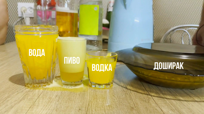 Одного пакетика Юпи хватает на 1,5 литра воды. Зная это мы с ювелирной точностью рассыпали содержимое 1 пакета по емкостям и добавили реагенты: воду, пиво, водку и доширак. Подождав согласно рецепту, пока лапша приготовится - мы принялись к проверке вкусовых свойств данных продуктов. К нашему удивлению, Юпи все еще хорош, действительно вкусненько, как то по особенному, с таким 8битным послевкусием.