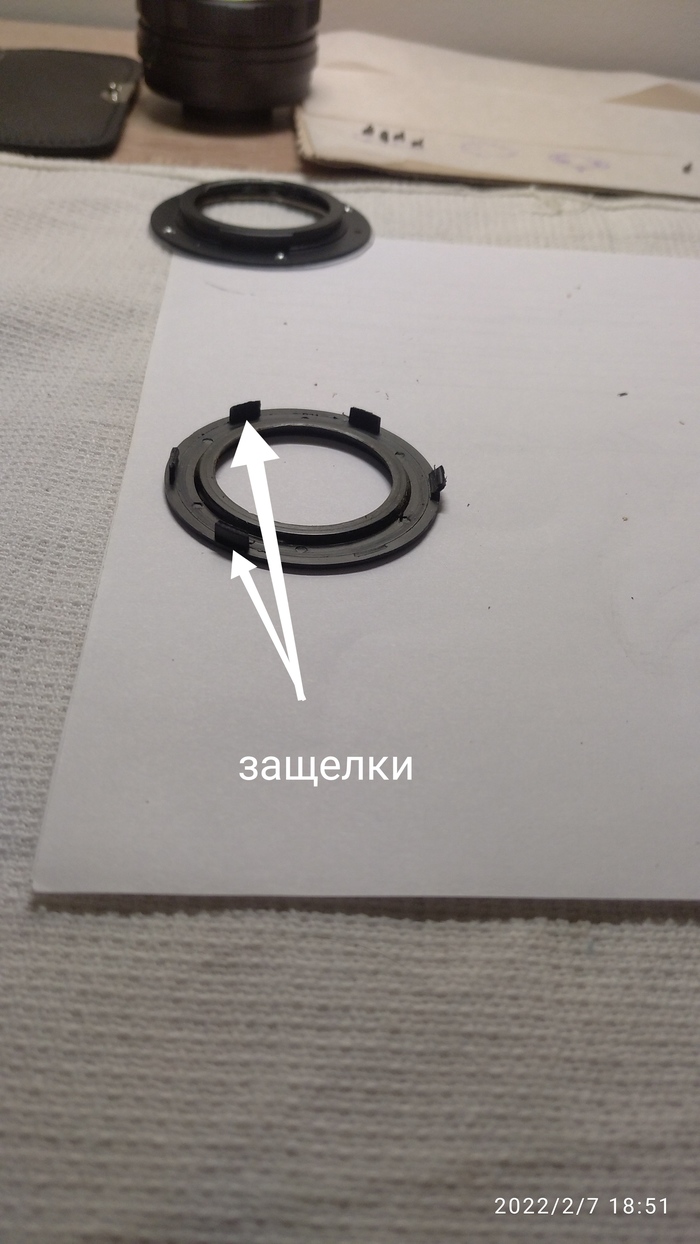 Говорят, что декоративное кольцо (с надписью "Гелиос") можно выкрутить. Мне попался вариант на защёлках. На мой взгляд выполнены они не удобно. Их 6 штук и крючки обращены внутрь. Снять кольцо получилось лишь просунув тонкую лопатку от линзы и пытаясь толкнуть защёлки наружу. При вскрытии одна защёлка отломилась (не критично).