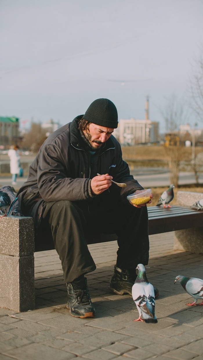 Бывший интеллигентный человек, всегда очень грустный, часто бывает по утрам в парке, где любит кормить голубей...
