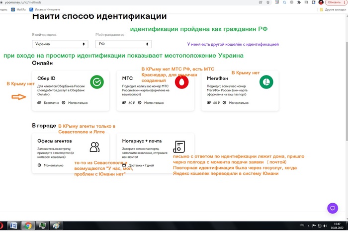 В дополнение скрин с пояснениями по идентификации, которая пройдена была не один раз, а дважды и оба раза я гражданин РФ указана. Местоположение выдает - Украина.