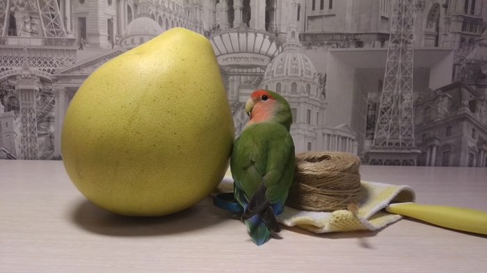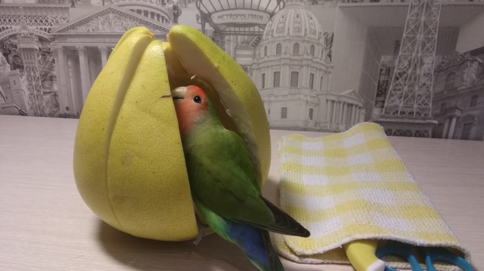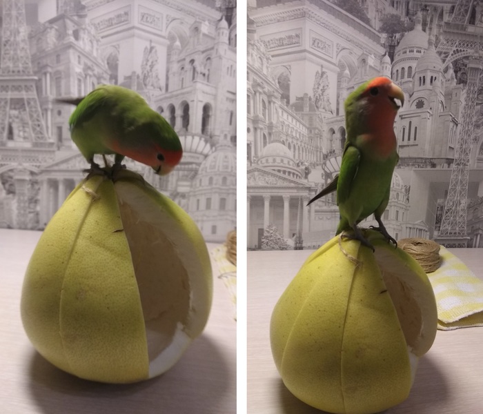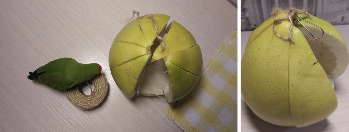 P.S. Белую мякоть я не убираю, Тотошику нравится отрывать ее и раскидывать вокруг себя. Через несколько дней домик высохнет и вход станет уже, тогда можно будет отрезать ещё один "лепесток" и подтянуть нитки. "Домик" будет менее вытянутым, если его сначала высушить, а потом уже подвесить.