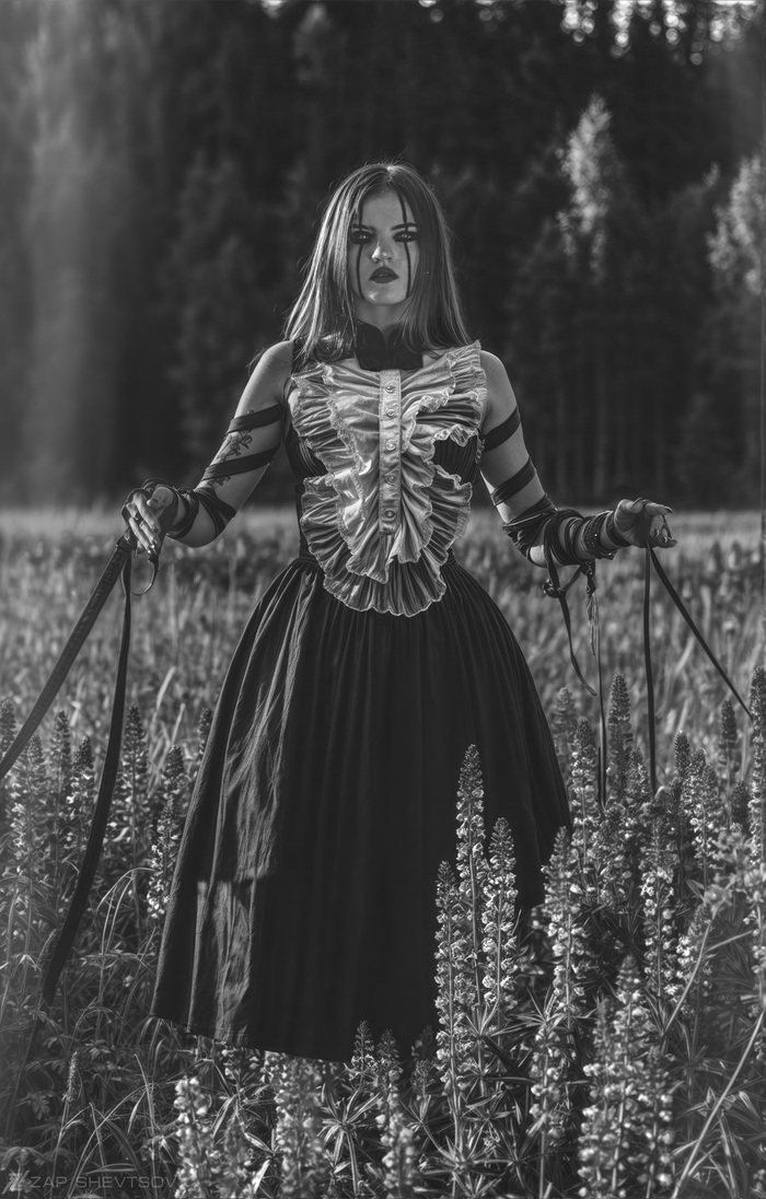 Чем необычны эти фотографии? Здесь использовалась довольно хитрая обработка, где использовались нейронки Krea и Topaz. Они были использованы только для большей искусственной детализации фартука и складок платья, а также для улучшения мейкапа (толщина линий).