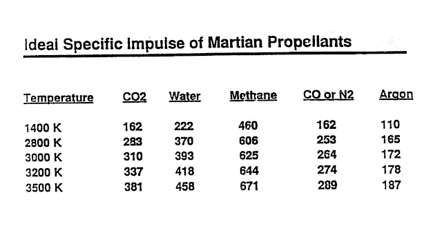 Наиболее важным для наших целей является выбор метана в качестве топлива. Он в шесть раз плотнее жидкого водорода, может храниться при температуре 100 К, что совместим с жидким кислородом, и его можно производить с использованием воды и углекислого газа. При высоких температурах он распадается на водород и углерод, превращая молекулы 16 г/моль в плазму 3,25 г/моль. Таким образом достигается удельный импульс, лишь немного меньший, чем при использовании жидкого водорода. Зубрин указывает его удельный импульс как 606 сек при нагревании до 2800 К или 625 сек при 3000 К.
