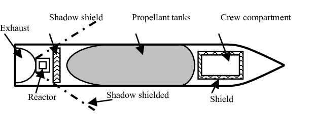 Следует отметить, что некоторая радиационная защита уже встроена в реактор. Бериллиевый или графитовый отражатель внутри ядерного реактора предотвращает выход некоторого количества излучения. Десятки тонн ракетного топлива, особенно метана, также эффективно поглощают нейтроны и всегда будут присутствовать в космосе. При использовании ядерной силовой установки будет использовано гораздо большее количество топлива, что даст несколько метров защиты. Кроме того, между двигателями и жилым отделением будет расстояние в 25 метров, поэтому фактически достигает защищаемую зону только 1/625 радиации.