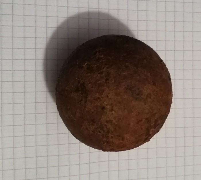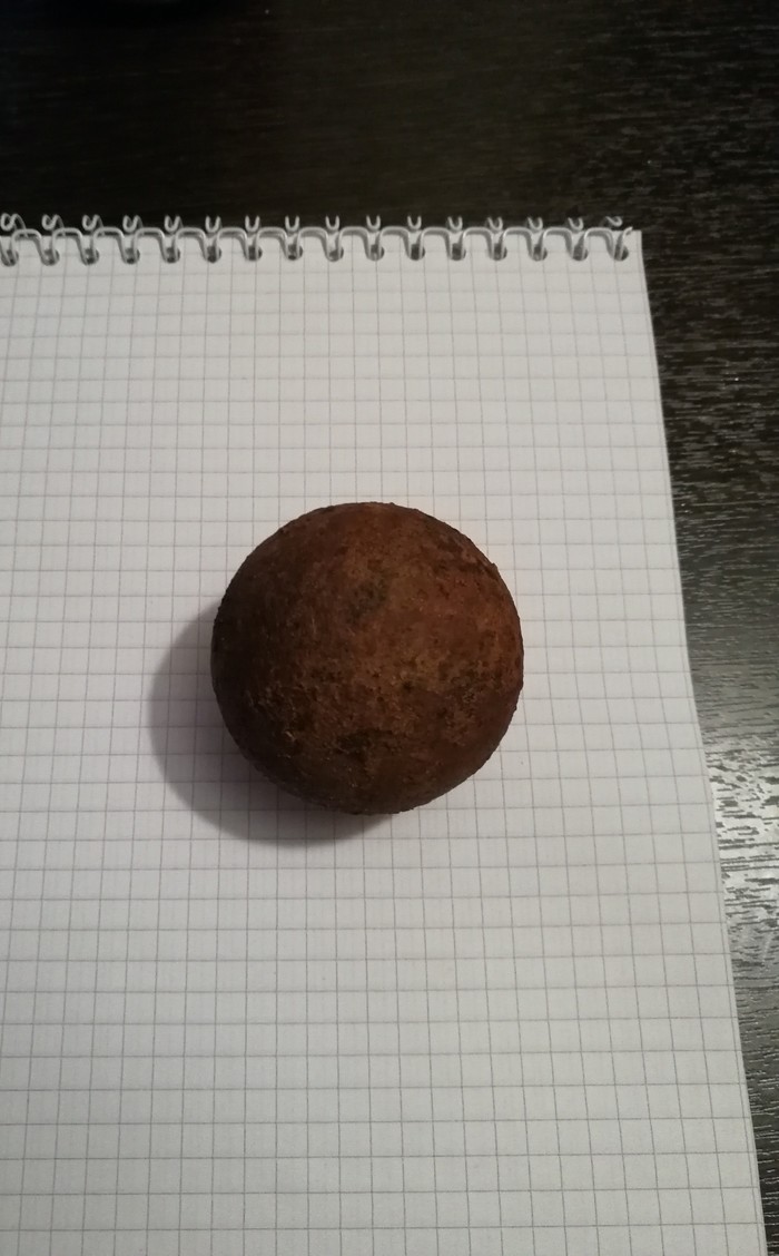 Находка увесистая - 475 грамма, диаметр 5 см. Материал понять не могу. Мысли идут в сторону ядра войны 1812 года.