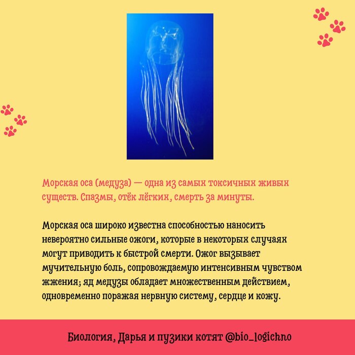 Конечно же морская оса опасна, тут даже обсуждать нечего, но мы все же обсудим. И так, что там такого опасного? Ну начнем с того, что яд этой коробочки смерти – это биологический коктейль из жутко опасных веществ. Полулетальная доза яда составляет 0,04 мг/кг — это самый сильный яд, известный у медуз. Тетрамин парализует нервные окончания, талассин поражает кровеносную систему и отключает легкие и гипнотоксин поражает нервную систему. Волосы зашевелились?