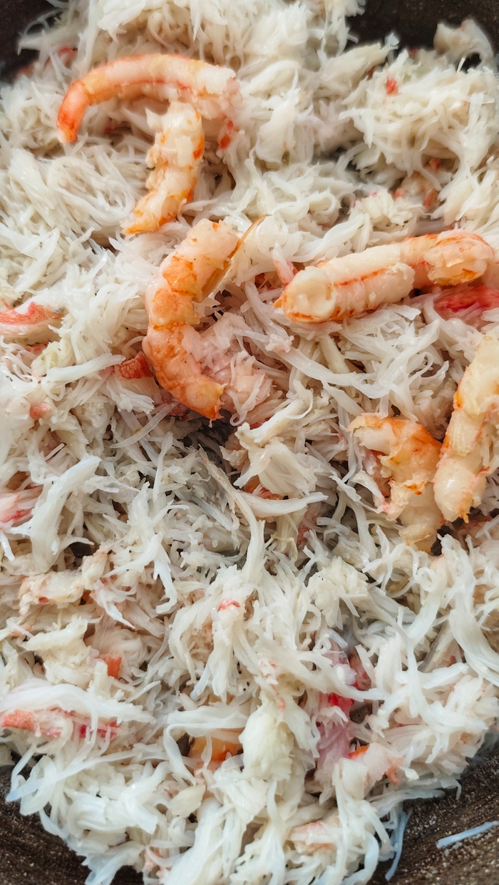 Яйцо обволакивает краб, но яичница по прежнему рассыпчатая.