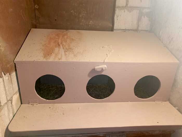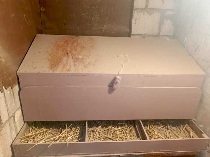 Так выглядит гнездовье установленное на место. Пол гнездовья сделан под наклоном, снесённое яйцо скатывается в лоток, и курица его не может его расклевать.