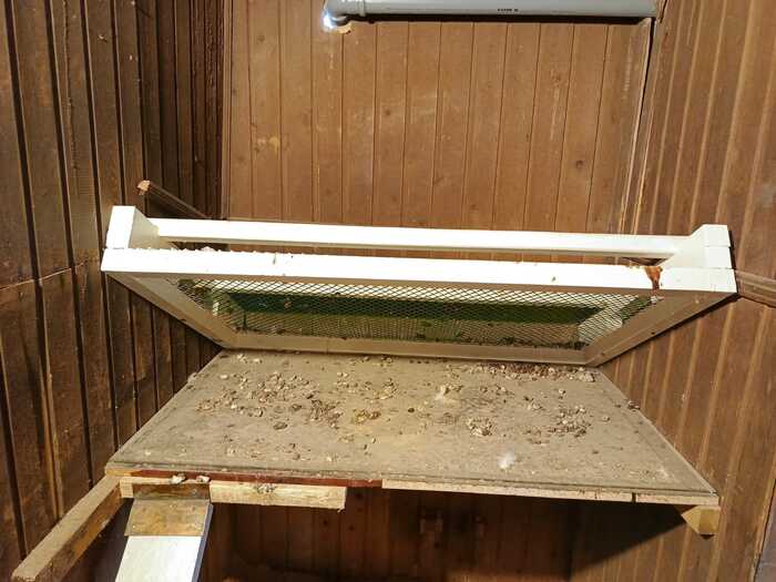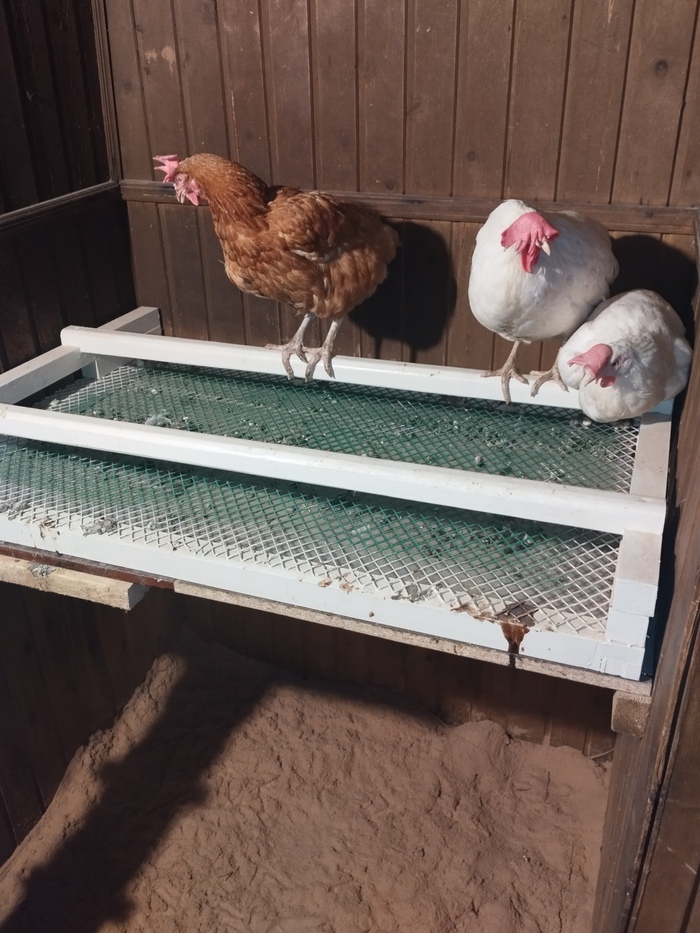 Благодаря такой конструкции насеста, под ним на уровне пола образуется чистое пространство, где куры могут гулять. В планах поставить туда ванночку с золой для купания кур.