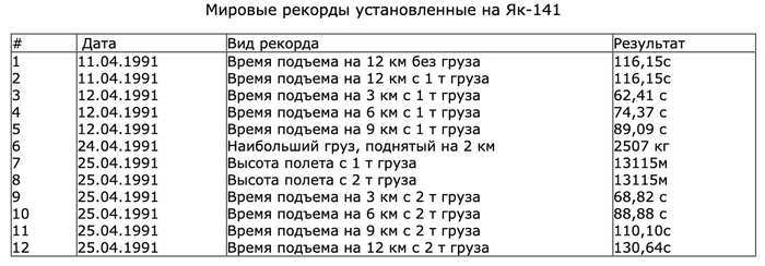 В апреле 1991 года лётчик-испытатель Андрей Синицын подтвердил уникальные возможности машины, поставив на «Яке» 12 мировых рекордов по скороподъёмности, максимальной нагрузке и высоте полёта с грузом. Несмотря на то, что полёты проводились не в идеальных условиях (температура была выше +15 °C), они показали полное превосходство машины над «Харриером» при наличии подвешенных грузов (без них Як-141 уступал сопернику по скороподъёмности). При этом из-за повышенной температуры оставался запас около 10 секунд для возможных последующих рекордов.