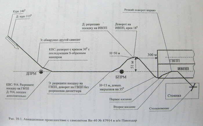 Через некоторое время, увидев, что на искусственную ВПП самолет уже приземлился, командир Як-40 вновь запросил разрешение посадки на грунтовую ВПП. Ответа не последовало и командир самовольно довернул на нее. Затем диспетчер дал разрешение садиться на искусственную ВПП, но самолет уже находится значительно левее. Боковое отклонение составляло в этот момент больше 50 метров и, по правилам, нужно было уходить на второй круг, но командир этого не сделал. Вместо этого он доворачивает вправо, обратно на искусственную ВПП.