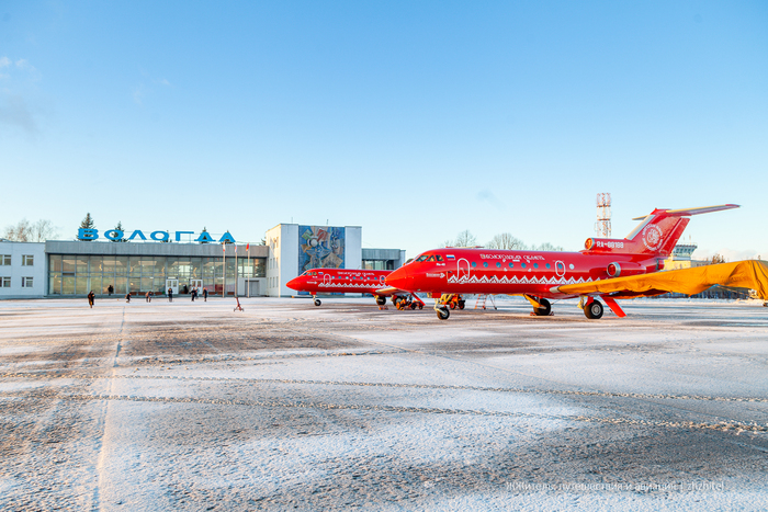В Вологду из Москвы летают старенькие Як-40. За самолетами следят и ухаживают. То, что историю в Вологде ценят и берегут, понимаешь еще на перроне. На здании аэровокзала сохранили оригинальную советскую мозаику «Гостеприимная Вологда».
