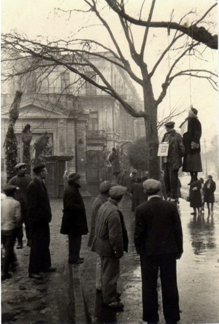 Советские партизаны, повешенные немцами на набережной имени Ленина в Ялте. На снимке — казненные участники молодежной подпольной группы Надежды Лисановой (расстреляна 24.02.1942 г.): Михаил Долгополов, Леонид Едыгаров, Владимир Пискунов, Леонид Финошин