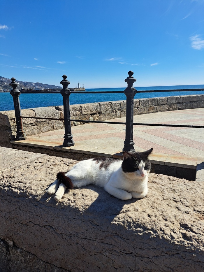 Живёт у моря. Раньше харчевался в кафе Апельсин, но потом его закрыли и теперь кота угощают люди. И море. Однозначно познал дзен :-)