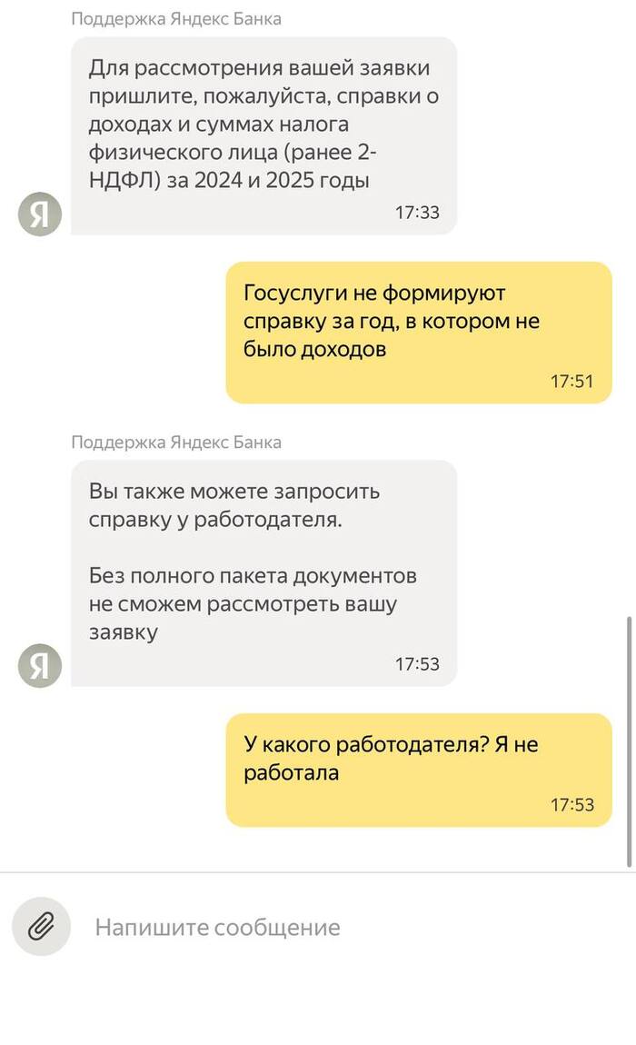 Ни на Госуслугах, ни в Моем налоге невозможно сформировать справку за 2024 год, потому что я НЕ работала. Я отправляла в Яндекс.Банк свидетельство о рождении ребёнка - мол, вот, смотрите, вместо вашего документа у меня есть другая писулька. Им, как говорится, буква Ю на барабане.