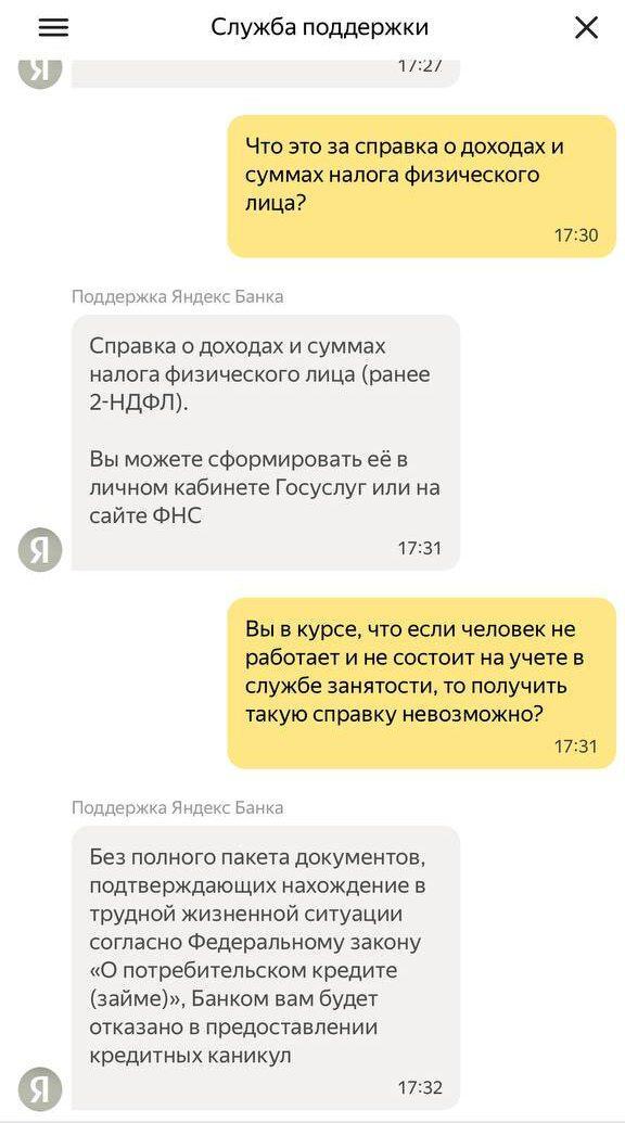 Никто не вникнет в твою ситуацию. Никто не будет разбираться, если вдруг ситуация не типичная и не шаблонная. Причем есть банк, который сразу, в тот же день, посмотрел мою справку и предоставил каникулы. И это кстати банк не такой именитый, как Яндекс, а скорее с таким именем, на который никогда не подумаешь, что там вообще всё чётко может работать.