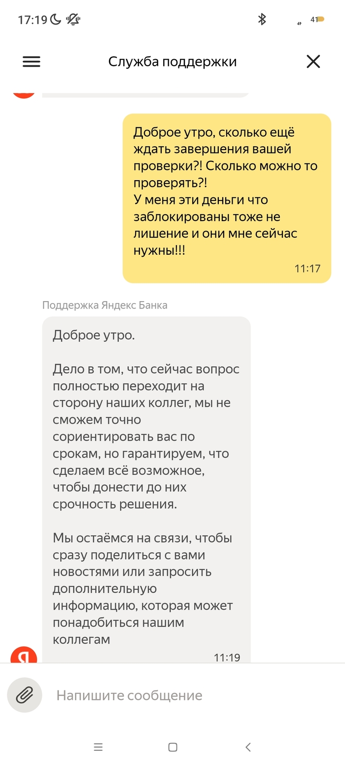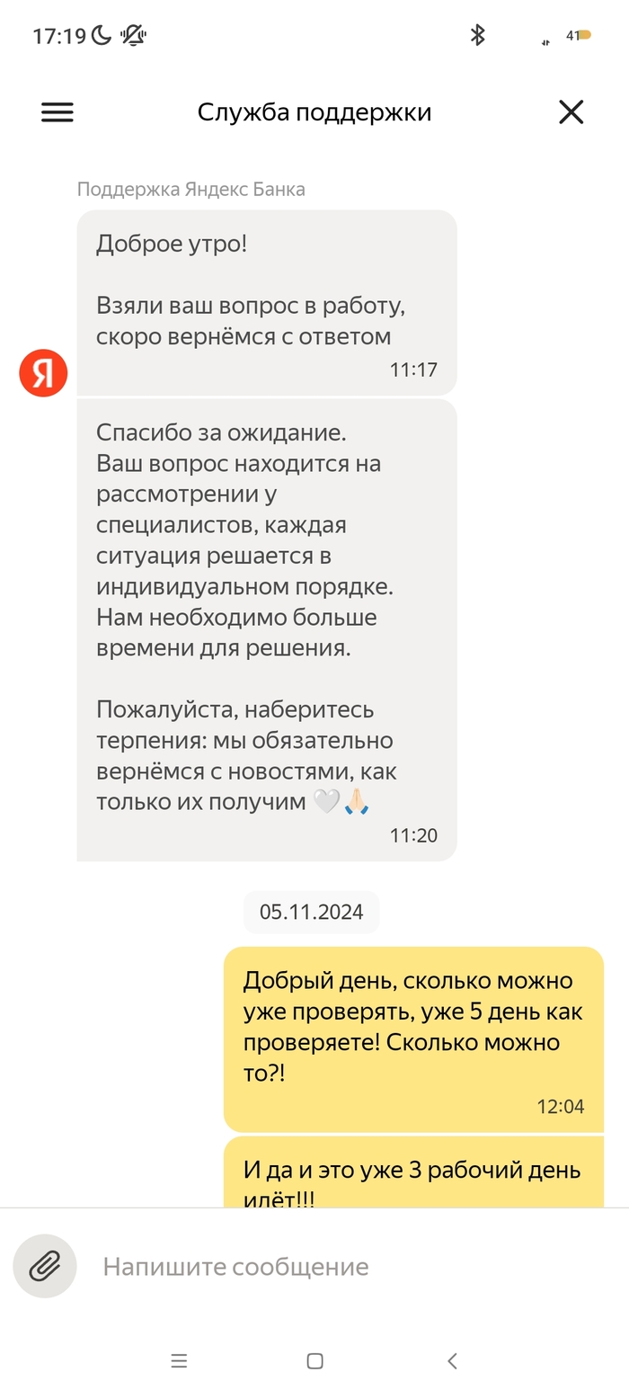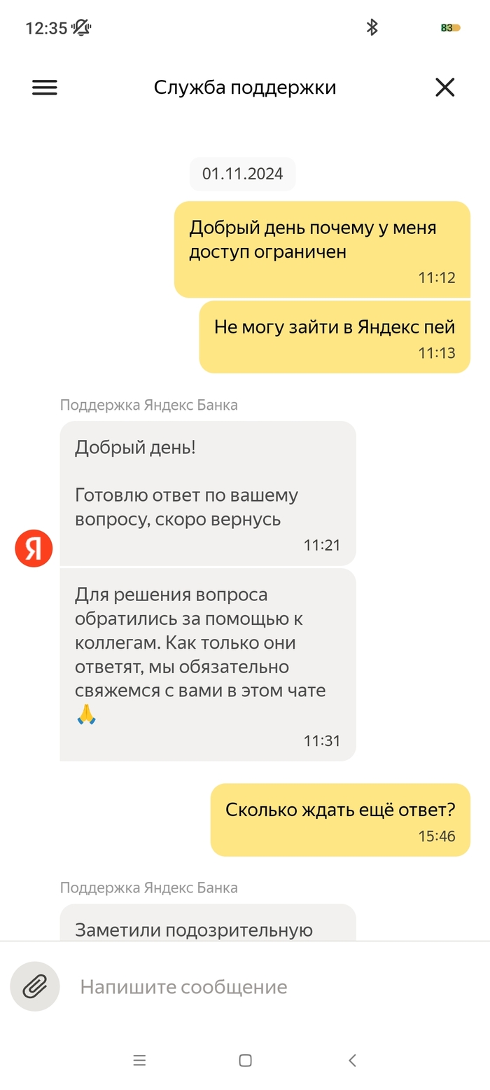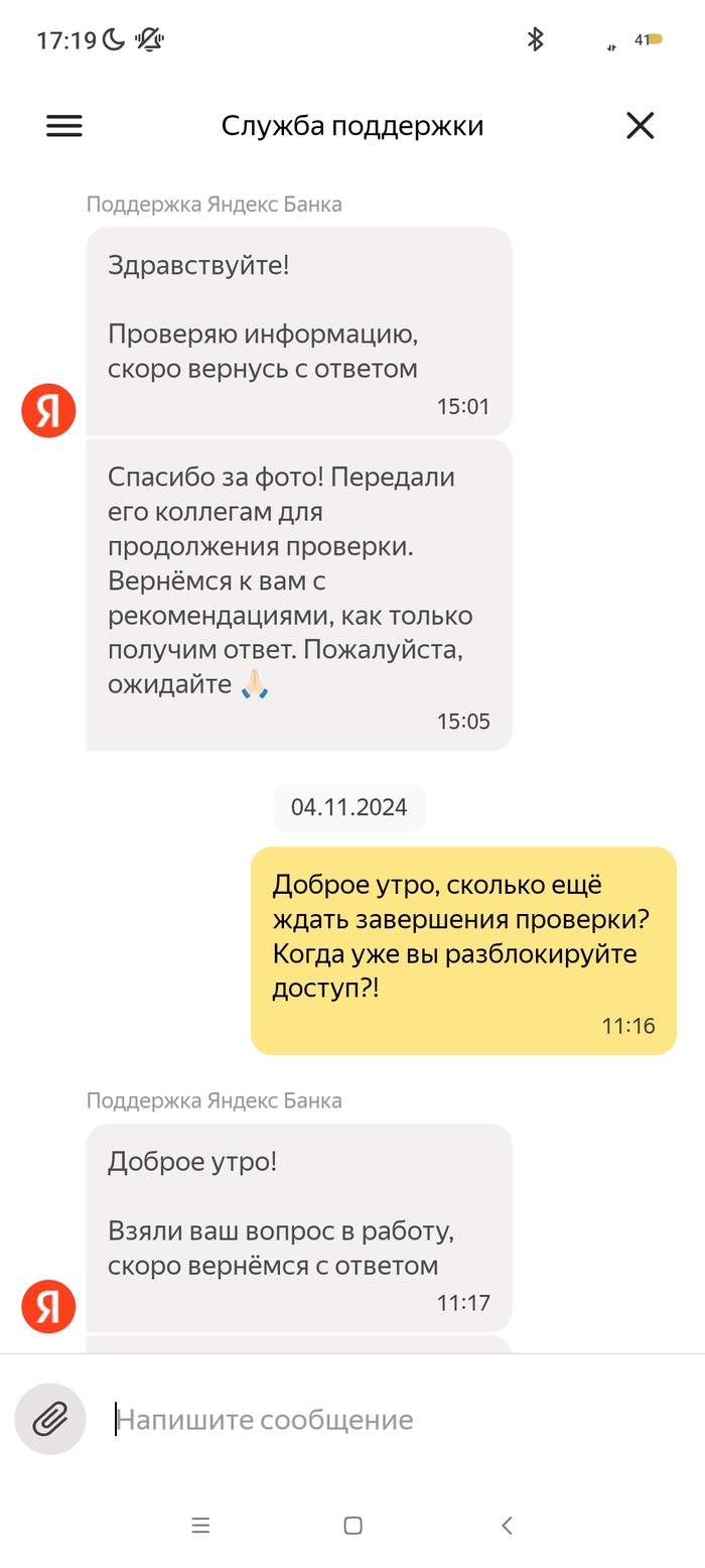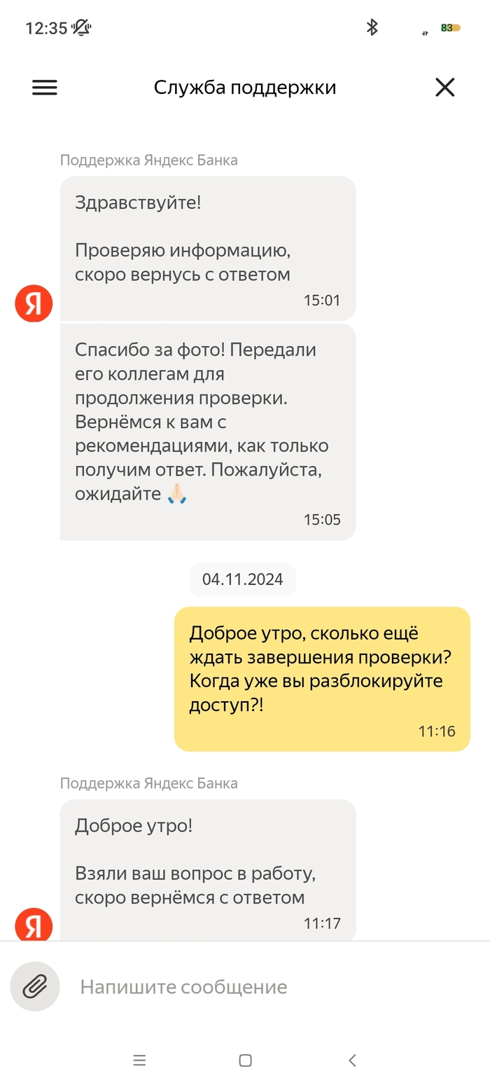 На меня в октябре 2024 года было открыто исполнительное производство судебным приставом - индексация кредитного платежа с арестом денежных средств на моих счетах, в том числе и на счету Яндекс Банка. 09.10.2024 пристав отменяет данное ИП и направляет документы (постановление об отмене постановления об аресте денежных средств на всех моих счетах). 10.10.2024 все банки снимают аресты денежных средств, как оказалось, кроме Яндекс Банка. По какой причине его не сняли в этом банке мне неизвестно, я им не пользовался. 03.11 я покупаю билеты на Яндекс.Афише и при оплате выбираю Яндекс Пэй, с другого банка отправляю нужную сумму по СБП. Дальше захожу в приложение Пэя и вижу, что денег на счету нет. При обращении в поддержку Яндекс Банка, они мне сообщают, что все списания были из-за исполнительного производства, напомню закрытого, но банку о закрытии неизвестно. Я им отправляю все документы об отмене ареста по счетам (именно с текстом, касающегося их банка и электронной подписью пристава) в чат. И задаю вопрос, когда мне поступит ответ по этим документам и снятие ареста, на что в поддержке мне отвечают, что сроков нет, всё индивидуально, ни от, ни до, ничего не могут назвать. Для меня это ввело в ступор, как это у такой крупной организации нет сроков рассмотрения обращений, с регламентом обслуживания сотрудники поддержки также не знакомы. Всё настолько сложно, что не могут прочитать своё же пользовательское соглашение. Зачем вообще они нужны непонятно?! Вот они уже неделю не могут дать никакого результата, постоянно отписки, мол ждите и всё. 07.11 я был у пристава, который выносил постановление об аресте и об отмене, она показала, что документ в Яндекс банк был действително отправлен, но не открыт ими. На что я попросил повторно отправить данный документ, что и сделала товарищ пристав. Единственный раз банк написал на электронную почту, что сотрудники якобы звонили мне неоднократно и не могут дозвониться, но у меня на данном номере нет от них пропущенных, тем более большого количества вызовов. 10.11 я позвонил им сам в поддержку и объяснил ситуацию со звонками, там мне заверили, что мне позвонят в течении дня, но так никто и не позвонил. Я уже писал везде, где возможно, но никакого ответа никто не даёт. Это максимально странно, что документ из 1 страницы изучают с 09.10 и не могут вынести решения. В отзывах я увидел, что у девушки такая же "песня", с августа не могут снять арест. При всех отправленных документах. Люди не дай Бог у них хранить весомую сумму, в случае каких-либо проблем останешься без денег. Настоятельно не рекомендую даже обращаться в этот банк! Куча негативных отзывов ...