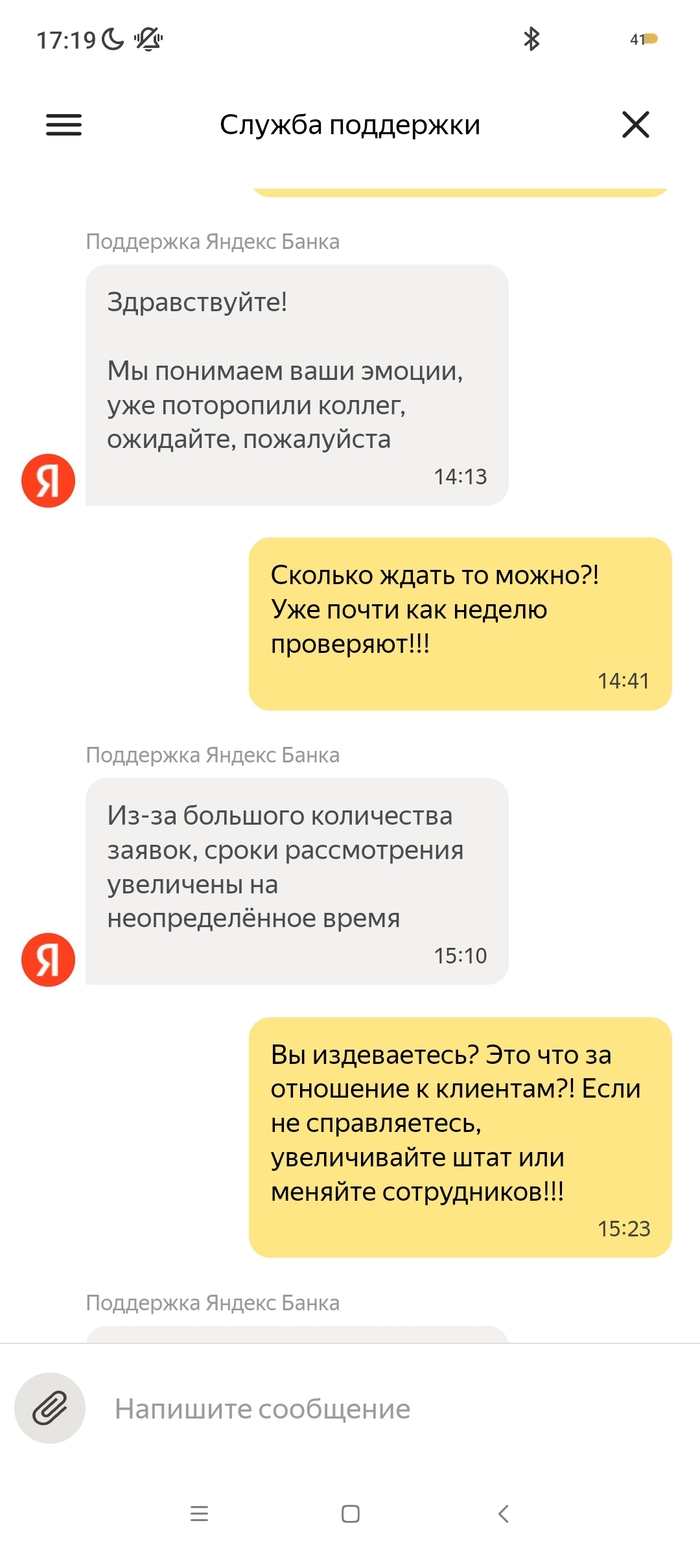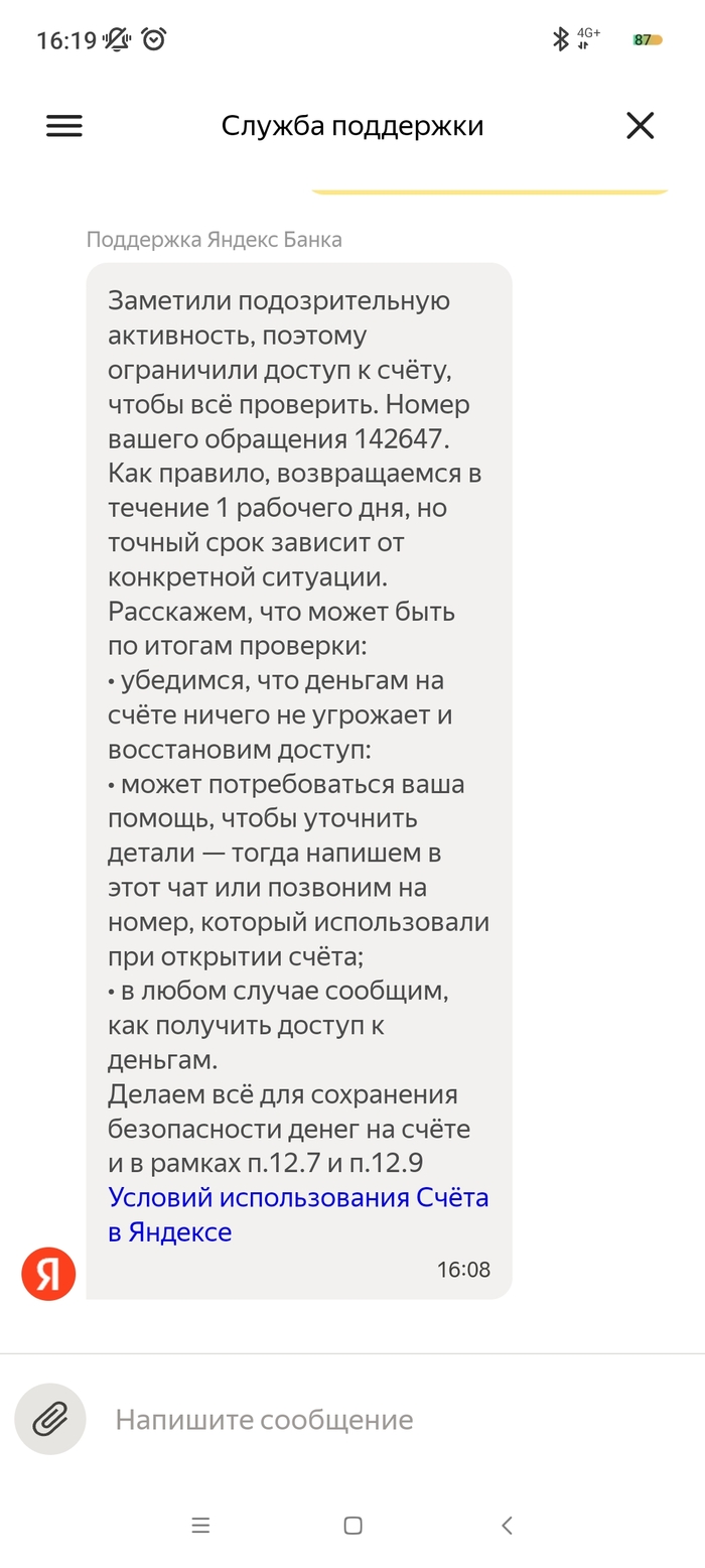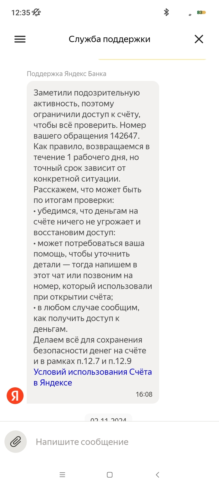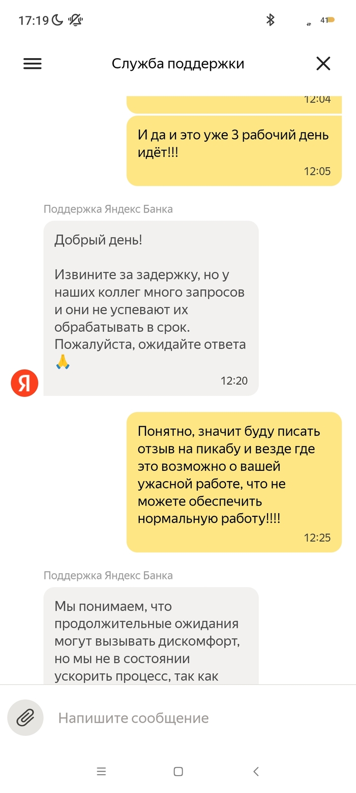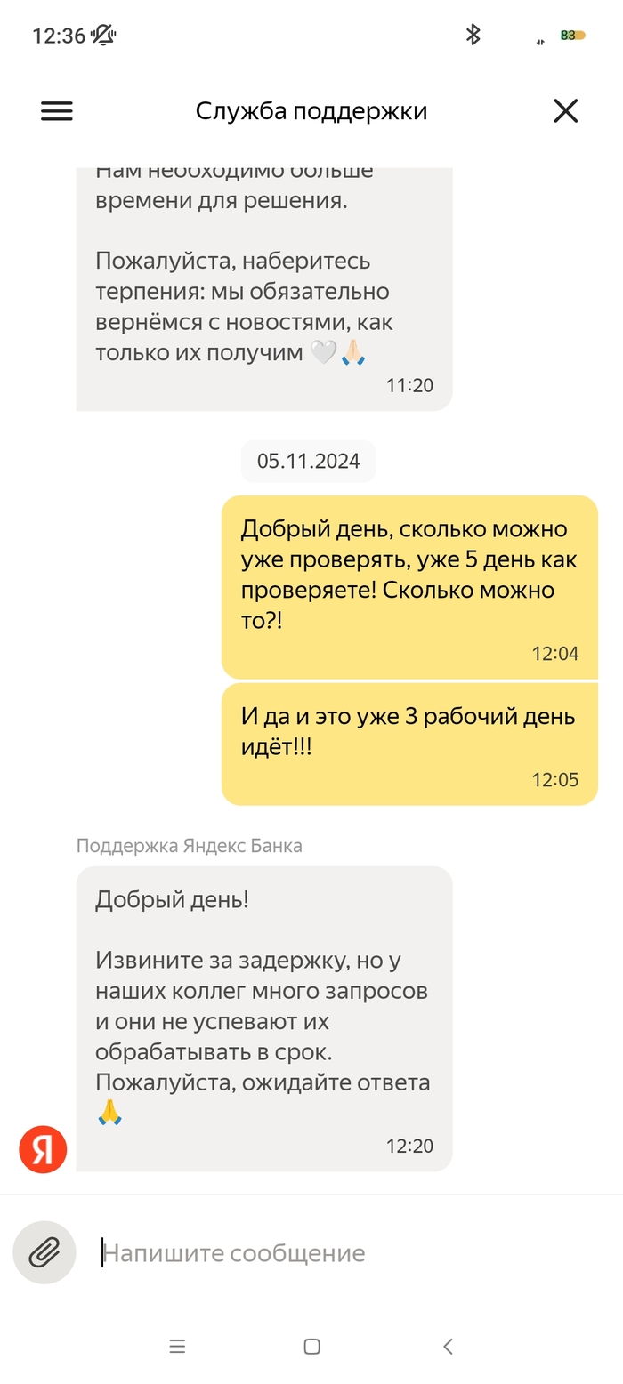 На меня в октябре 2024 года было открыто исполнительное производство судебным приставом - индексация кредитного платежа с арестом денежных средств на моих счетах, в том числе и на счету Яндекс Банка. 09.10.2024 пристав отменяет данное ИП и направляет документы (постановление об отмене постановления об аресте денежных средств на всех моих счетах). 10.10.2024 все банки снимают аресты денежных средств, как оказалось, кроме Яндекс Банка. По какой причине его не сняли в этом банке мне неизвестно, я им не пользовался. 03.11 я покупаю билеты на Яндекс.Афише и при оплате выбираю Яндекс Пэй, с другого банка отправляю нужную сумму по СБП. Дальше захожу в приложение Пэя и вижу, что денег на счету нет. При обращении в поддержку Яндекс Банка, они мне сообщают, что все списания были из-за исполнительного производства, напомню закрытого, но банку о закрытии неизвестно. Я им отправляю все документы об отмене ареста по счетам (именно с текстом, касающегося их банка и электронной подписью пристава) в чат. И задаю вопрос, когда мне поступит ответ по этим документам и снятие ареста, на что в поддержке мне отвечают, что сроков нет, всё индивидуально, ни от, ни до, ничего не могут назвать. Для меня это ввело в ступор, как это у такой крупной организации нет сроков рассмотрения обращений, с регламентом обслуживания сотрудники поддержки также не знакомы. Всё настолько сложно, что не могут прочитать своё же пользовательское соглашение. Зачем вообще они нужны непонятно?! Вот они уже неделю не могут дать никакого результата, постоянно отписки, мол ждите и всё. 07.11 я был у пристава, который выносил постановление об аресте и об отмене, она показала, что документ в Яндекс банк был действително отправлен, но не открыт ими. На что я попросил повторно отправить данный документ, что и сделала товарищ пристав. Единственный раз банк написал на электронную почту, что сотрудники якобы звонили мне неоднократно и не могут дозвониться, но у меня на данном номере нет от них пропущенных, тем более большого количества вызовов. 10.11 я позвонил им сам в поддержку и объяснил ситуацию со звонками, там мне заверили, что мне позвонят в течении дня, но так никто и не позвонил. Я уже писал везде, где возможно, но никакого ответа никто не даёт. Это максимально странно, что документ из 1 страницы изучают с 09.10 и не могут вынести решения. В отзывах я увидел, что у девушки такая же "песня", с августа не могут снять арест. При всех отправленных документах. Люди не дай Бог у них хранить весомую сумму, в случае каких-либо проблем останешься без денег. Настоятельно не рекомендую даже обращаться в этот банк! Куча негативных отзывов ...