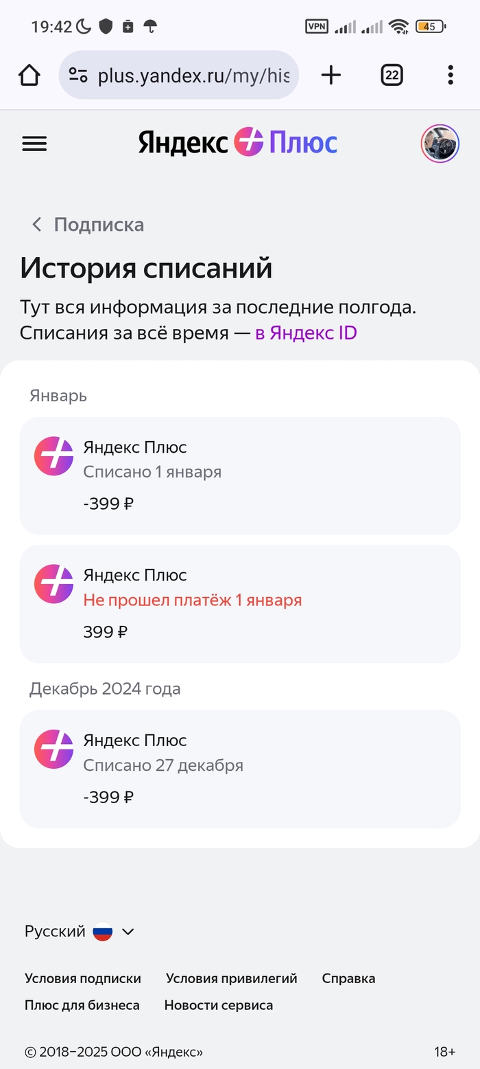 Месяцем ранее решил завести карту Яндекс банка, мол Яндекс пей все дела, вроде прикольно, ещё р в такси подрабатывал, падало сразу на карту, ну вполне-вполне думаю. Карта автоматом привязалась к Яндекс плюсу и отвязать ее было не нельзя. И тут пошло, с 15 декабря каждый день была попытка списания за Яндекс плюс, хотя говорили до конца года, ну думаю ладно, 27 декабря закинул денег на карту, конечно же сразу было списание, ну думаю видимо за январь, все норм. И тут сегодня снова пришло списание, за что не понятно, ну скорее понятно, это за январь, а что тогда списали 27 декабря я не понимаю. Причем подписка была активна, нигде не писали, что надо оплатить, спокойно слушал музыку.