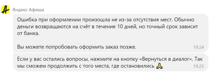 Переписку с ТП Яндекс банком и Яндекс афишей не вижу смысла кидать.