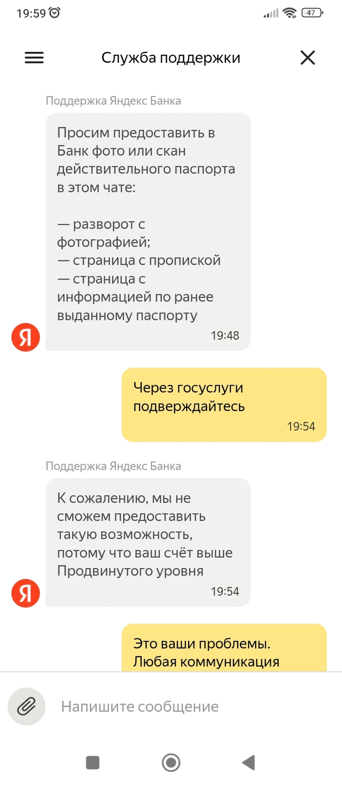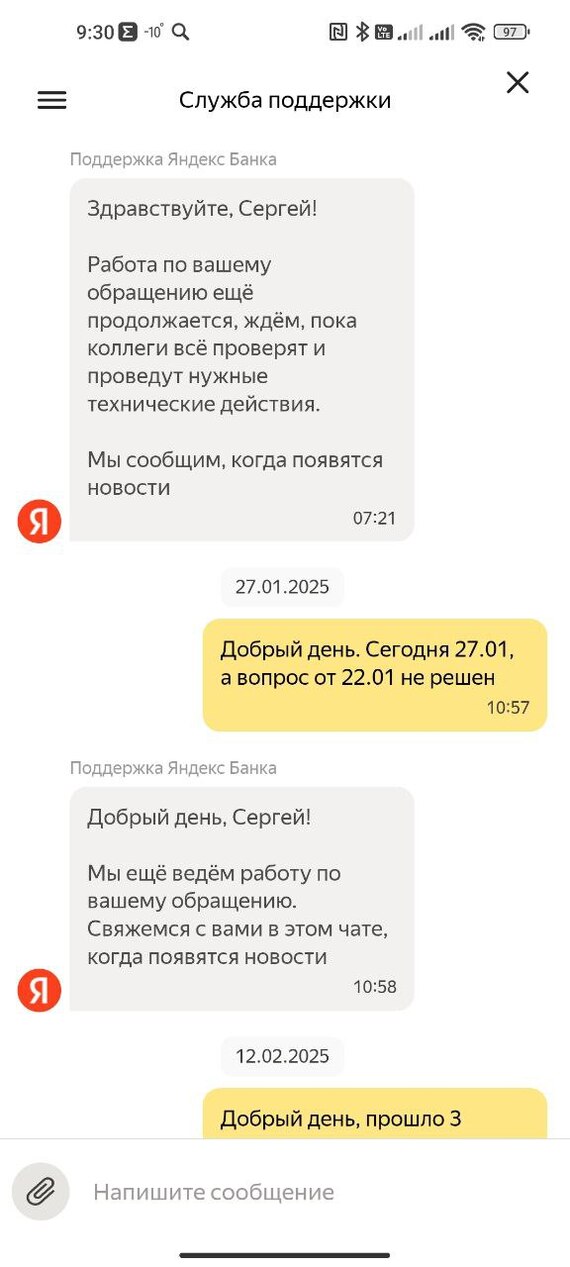 Тут же предоставил им всё что потребовали,а это селфи с паспортом и фотографию заявления о закрытии счёта,это было 18.12.24г.Ну думаю,сейчас переведут и распрощаюсь с этим гавнобанком,но не тут то было. Стандартный ответ оператора "ждите,коллеги работают,как получим ответ вернёмся к вам в чат"день,два,три,неделя,вторая-коллеги всё работают.Согласно статье 859 ГК РФ банк обязан вернуть средства клиенту в течении 7-ми дней,но 7 дней давно прошли.Писал обращение в ЦБ РФ,но и это как оказалось бесполезно.Осталось только в прокуратуру обращаться,что я и сделаю в ближайшее время.У меня вообще слов на них нет!Почитал отзывы на banki.ru,sravni.ru так там людям и через месяц не возвращают их же деньги,причём блокируют просто так,люди открывают карту Яндекс банка,переводят туда деньги и они тут же блокируют,и потом начинаются качели с техподдержкой.Им вообще плевать какие у людей проблемы,может у кого-то это последние деньги,и людям просто не на что жить. По сей день поддержка ссылается на своих "коллег",которые ведут работу,ждите в порядке очереди👍